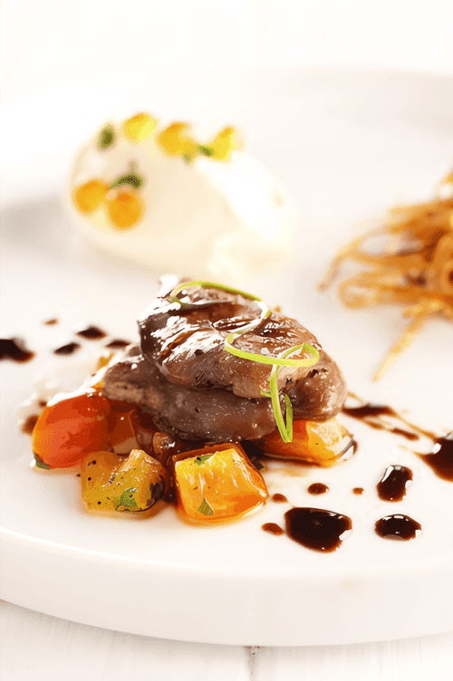Duck breasts with spices and a salad of peaches and chili is an exquisite dish of Chinese cuisine that combines the tenderness of duck meat with vibrant fruity notes. The aroma of coriander and black pepper enriches the flavor of the breasts, adding spiciness, while grilling makes the skin crispy and golden. The salad of ripe peaches, lime, fresh mint, and spicy chili provides a refreshing contrast that highlights the depth of meaty tones. This dish is suitable for both festive dinners and gastronomic experiments where the sweetness of fruits, spiciness of pepper, and richness of duck meat come together. It pairs wonderfully with light white wine or jasmine tea, creating a harmony of flavors and aromas.