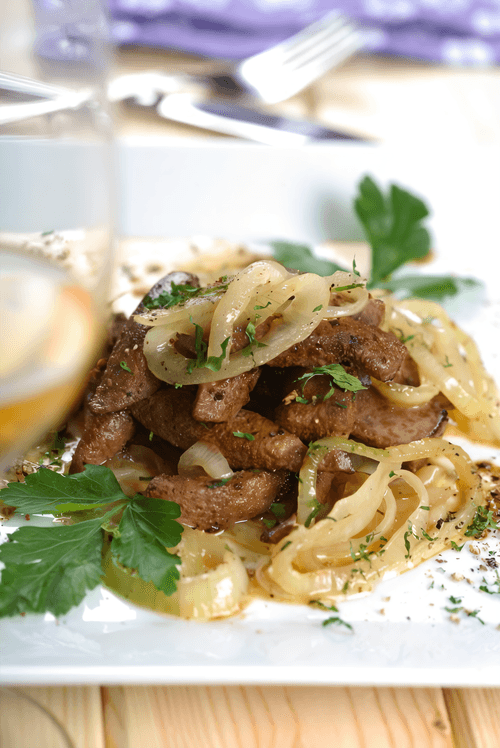 Cut the meat into pieces, place on plates, drizzle with cream, and add onions. Garnish with sprigs of cumin. Serve with potatoes.