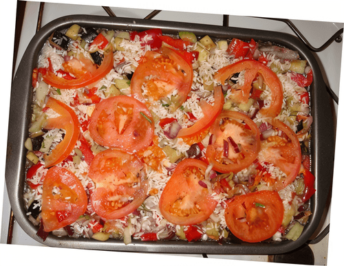 Place half of the chopped tomatoes in a pot (preferably in a ceramic baking dish). On the layer of tomatoes, sprinkle half of the mixture from the bowl with eggplant, pumpkin, pepper, and onion. Layer the meat on top of the vegetable mixture, then sequentially add the remaining vegetable mixture, rice, and tomatoes.