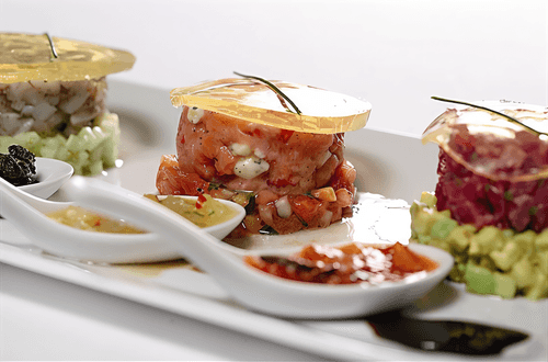 On a portion plate, use molds to arrange the garnish, then top with tartar made of salmon, tuna, and scallops. Garnish with chives.
