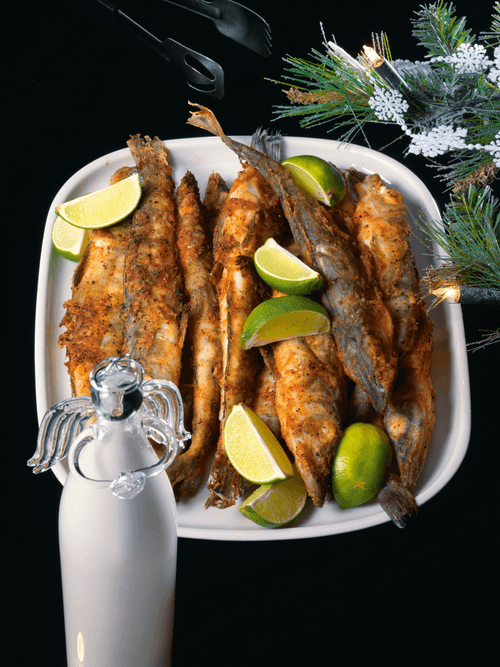 Thaw the fish in the refrigerator, remove the entrails as they are bitter. Mix flour with paprika, black pepper, and salt. Grate the zest from all the lemons and coat each fish with it. A little zest should also be added to the empty belly.