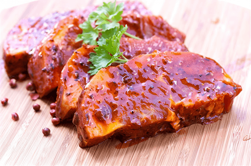 Cut the pork fillet into 1 cm thick pieces, salt, and sprinkle with red pepper. Place in a steamer tray and cook for 17 minutes.