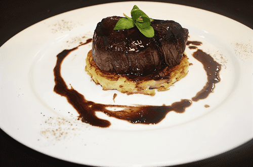 Beef tournedos on a planche with Barolo sauce