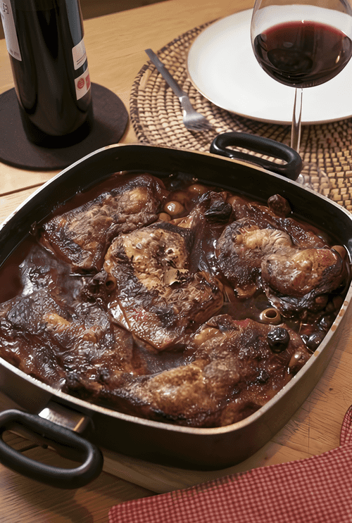 Coq au Vin is one of the most famous traditional French recipes, originating from the French countryside. It translates to 'rooster in wine', originally made with tough rooster meat that became tender through long braising in red wine. Today it is prepared with chicken while retaining its rich flavor and aroma. The combination of tender meat, crispy bacon, sweet prunes, and a rich sauce makes this dish perfect for a cozy dinner. The deep flavor and balance of wine's acidity with the spicy notes of cumin create a harmony that unfolds in every bite. Coq au Vin is served with mashed potatoes or crispy baguette to enjoy the delightful sauce. It is a gastronomic delight filled with French charm and tradition.
