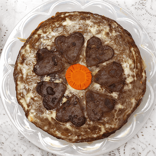 Place the liver cake on a plate, spread a mixture of carrots and onions with mayonnaise. Cover with another cake, which is spread with a mixture of egg whites and mayonnaise, then cover with a third cake, spread with the remaining mayonnaise.