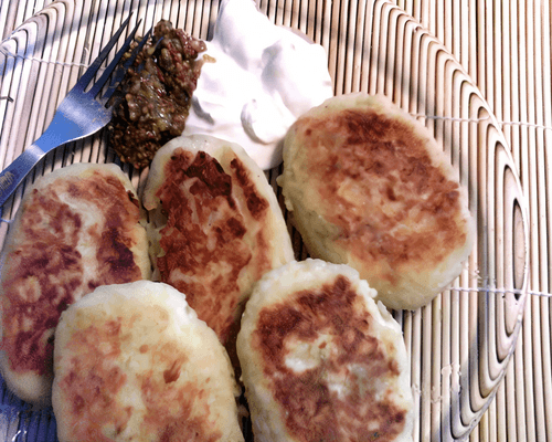 Peel the potatoes, boil them, cool slightly to grate on a coarse grater, add salt, and raw eggs. Add ground pepper, oregano, parsley, or dill to taste.