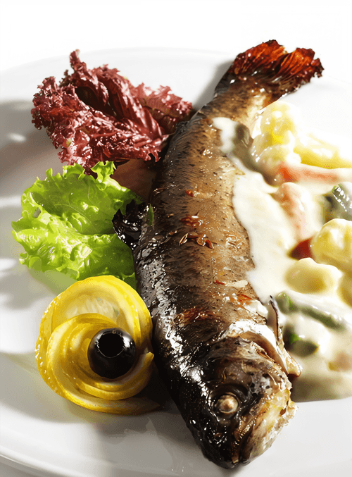 Whole salmon baked in sea salt is a dish rooted in European culinary traditions. Baking fish in a salt crust preserves its juiciness and reveals its natural flavor, while spices like coriander, fennel, and black pepper add subtle aromatic notes. Lemon and leek highlight the freshness and lightness of the dish. This cooking method creates an impressive appearance, and breaking the salt crust before serving becomes a true culinary ritual. Served with olive oil and lemon slices, this salmon becomes the centerpiece of the festive table, delighting with its rich flavor and tender texture.