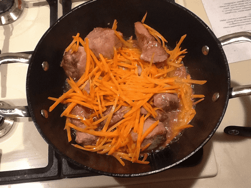 Add meat to the boiling fat and fry. Once a crust forms, add the carrot (it should sizzle actively when added), then after 5-7 minutes, add the onion. Do not reduce the heat or cover. If there isn't enough fat, add a little vegetable oil. And salt to taste.