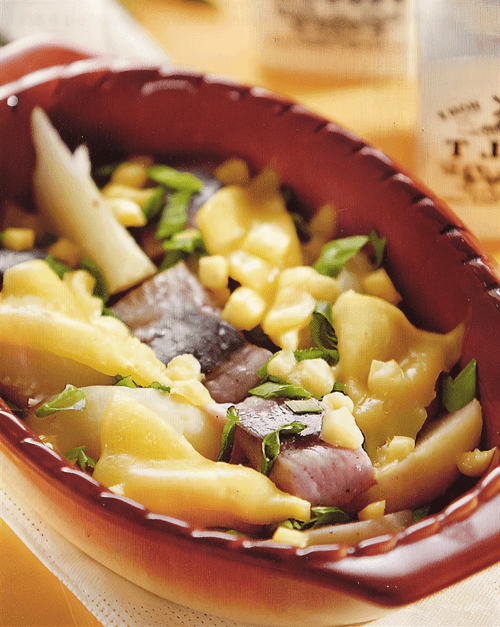 Place pieces of cheese on the potatoes, and sprinkle cheese cubes on top of the herring.
