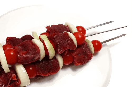 Skewer the meat with tomatoes, alternating them. Place on the grill and cook for 10-14 minutes until done.