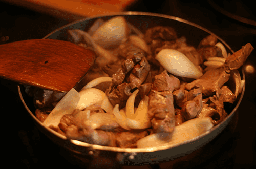 Cut small onions into four parts and separate into petals. In a hot wok, heat a small amount of vegetable oil and quickly fry the hearts while stirring constantly. Once they are slightly browned, add chopped onion and garlic, and fry, stirring continuously, until the onion becomes slightly translucent but remains crispy.