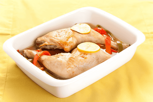 Wash the chicken, cut it into portions, and place it in a microwave-safe dish. Add vegetables, herbs, vinegar, wine, fat, and a little water. Season with salt and pepper.