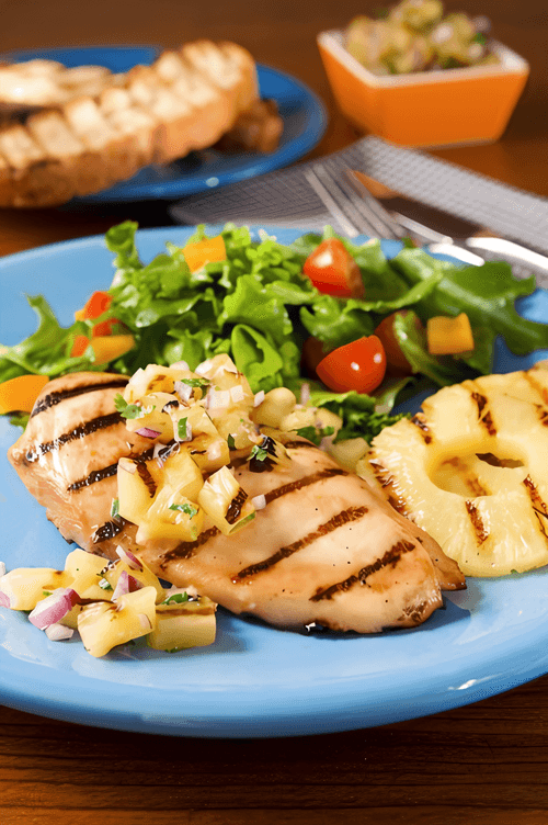 Grilled chicken with pineapple is a vibrant dish of Pan-Asian cuisine that combines the freshness of tropical fruits and the juiciness of meat. Pineapple soaked in aromatic lime dressing caramelizes on the grill, revealing its sweetness and slight acidity. Chicken fillet marinated with mint, lime, and olive oil gains incredible tenderness and rich flavor. Spicy notes of black pepper complement the harmony of ingredients, making the dish balanced. This chicken is perfect for summer picnics and light dinners, delighting with its exquisite taste and aroma. It is recommended to serve it with lime slices that add freshness and highlight the exotic character of the dish.