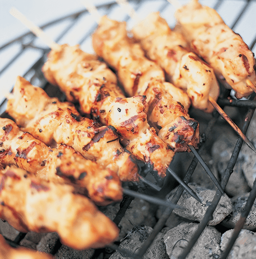 Chicken shashlik marinated in wine with lemon, thyme, rosemary and juniper berries