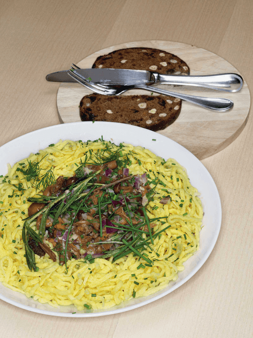 Melt butter in a pan and lightly sauté finely chopped garlic, then add the dumplings, mix with the butter, and serve with mushrooms.