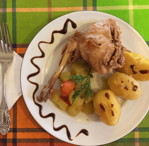 Rabbit with rosemary is a refined dish of French cuisine infused with Mediterranean aromas. Its roots trace back to the traditions of rural gastronomy in France, where fresh herbs, garlic, and olive oil create an exquisite yet simple flavor. The tender rabbit meat marinated in lemon, honey, and rosemary takes on a light sweetness, citrus freshness, and subtle spicy note. Roasted cherry tomatoes add juiciness and brightness, creating a harmony of flavors. This dish pairs perfectly with a glass of white wine and a crispy baguette, transforming any dinner into the atmosphere of French Provence. Rabbit with rosemary not only delights with its refined taste but also serves as a light and healthy choice for connoisseurs of exquisite cuisine.