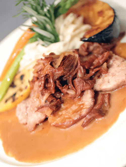 In a saucepan, heat a small amount of butter and olive oil. Add finely chopped shallots, diced mushrooms, and sauté until soft. Add chanterelles, mix, sprinkle lightly with flour, and pour in the broth. Cook until slightly thickened.