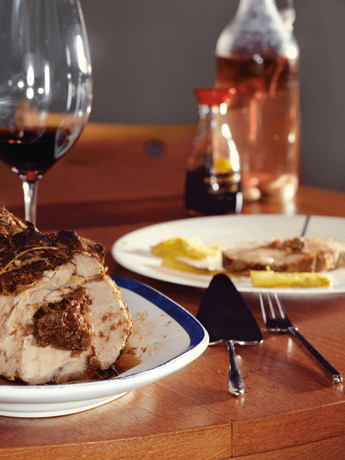 Pork with figs is a delightful combination of juicy meat and the sweet, spicy notes of ripe figs. This recipe has roots in Russian culinary tradition where meat is often marinated in aromatic brines for depth of flavor. The fig used for stuffing adds exquisite sweetness and a soft texture complemented by shallots, fennel, and balsamic vinegar. After roasting, the pork acquires a rich aroma of spices, caramelized filling, and a crispy crust. The dish is perfect for festive dinners, highlighting the richness and warmth of home cooking. It is served with caramelized fennel that adds a light freshness and complements the sweet-spicy flavor of the meat. Pork with figs is a true gastronomic delight that unites the harmony of flavors and the tradition of preparing juicy roasted meat.