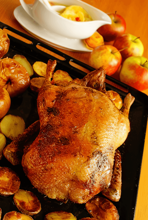 Roast duck with apples and celery is a gourmet dish of French cuisine that combines the tenderness of duck meat, the sweetness of apples, and the spicy aroma of celery. Historically, it was often prepared in the autumn when apple harvests reached their juiciness. The filling of onions, celery, and breadcrumbs with apples gives the bird a rich flavor while spices enhance its natural softness. Roasted to a golden crust, the duck becomes a true centerpiece of the festive table. This dish pairs perfectly with a glass of red wine and a light side dish like roasted vegetables. It not only delights the taste buds but also creates an atmosphere of coziness and warmth, making any meal special.