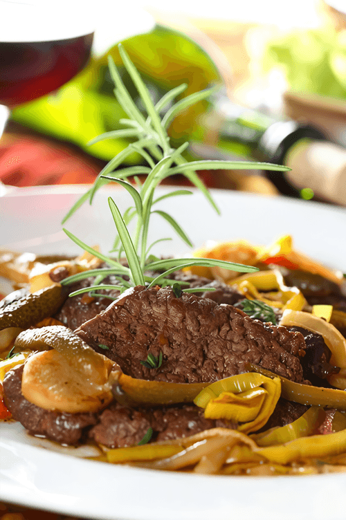 Beef tenderloin with onion-orange appetizer is a refined dish of European cuisine, combining the rich flavor of meat with bright citrus notes. Its roots can be found in traditional Mediterranean recipes where meat is often paired with fruits for flavor balance. The honey-vinegar dressing adds zest, while olives and parsley enhance the aromatic palette with freshness and a hint of saltiness. The medium-cooked beef tenderloin remains tender and juicy, while the onion and orange appetizer adds contrast in textures and flavors. This dish is perfect for a festive dinner or romantic evening, creating a harmony of taste and elegance on the plate.