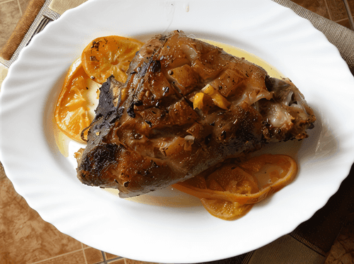 Pork knuckle baked on mandarins is a refined dish of Austrian cuisine where traditional meat gastronomy meets delicate citrus freshness. Historically considered a peasant dish, it has become a centerpiece for festive tables over time. Marinating in salt, mustard, and aromatic herbs adds depth to the meat's flavor while baking in foil preserves its juiciness. Mandarins contribute a light caramel sweetness and subtle acidity, making the taste unique and layered. The crispy crust and fragrant mandarin juice create a perfect texture combination. The knuckle is served hot with baked fruits and fresh greens and pairs wonderfully with mashed potatoes, stewed vegetables or sauerkraut, becoming not only delicious but also an elegant dish for special occasions.