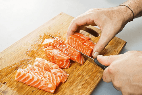 While the vegetables are boiling, remove the salmon fillet from the skin, carefully remove the bones from the meat (it's best to have a culinary tweezers on hand for this purpose), and then cut it into small pieces. Finely chop the parsley.