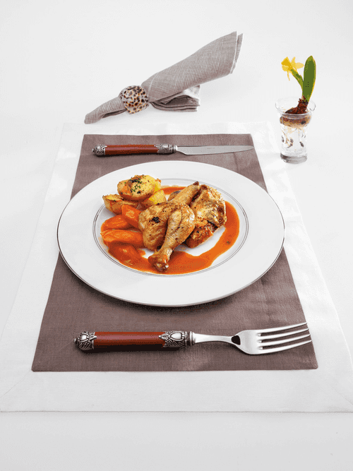 Divide the butter into six parts and spread each piece under the chicken skin, coating the meat. You can leave some butter to grease the inside of the carcass. Salt and let the chickens rest for half an hour at room temperature.