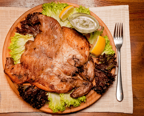 Chicken Tabaka is a gem of Georgian cuisine, infused with the spirit of Caucasian traditions. This dish, created through a unique pressing method, impresses with its crispy crust and tender, juicy meat. The aroma of fresh garlic mixed with dill and lemon juice gives the dish a rich flavor and zesty freshness. White pepper adds a mild yet expressive spiciness, while the browned crust offers subtle notes of caramelized taste. Chicken Tabaka is served with garlic sauce that makes it even more appetizing, perfectly pairing with a glass of red wine or fresh vegetables. This dish is not just food but a whole ritual of enjoying the taste and atmosphere of Georgian hospitality.