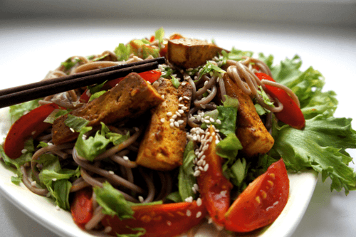 Buckwheat noodles with tomatoes, tofu, and basil is a dish that combines traditional Asian ingredients with a refreshing Mediterranean touch. Buckwheat noodles, known for their nutty flavor and light texture, pair wonderfully with soft, tender tofu that absorbs the flavors of frying and spices. Juicy tomatoes add brightness and freshness, while basil provides a pleasant spiciness. Sesame and olive oil, along with curry and soy sauce, create a rich, balanced taste. This dish is perfect for a light dinner or lunch, offering warmth and richness. Inspired by Chinese and Japanese culinary traditions, it is both simple and elegant.