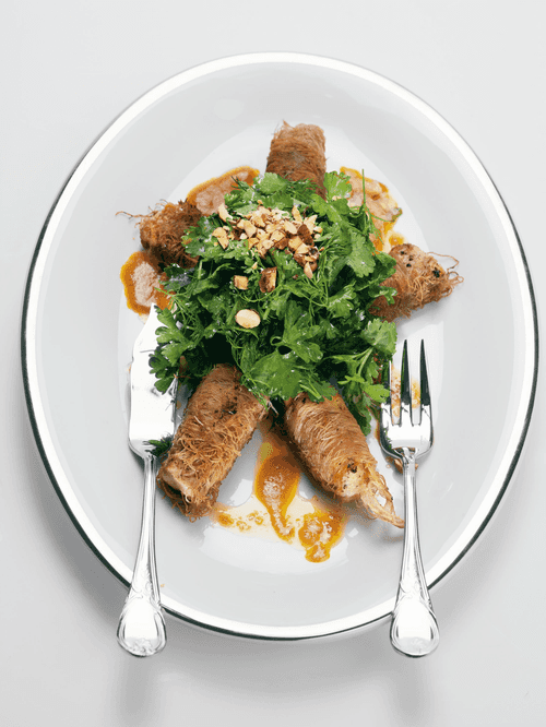 Cut the salmon fillet into 20 equal pieces. Salt and pepper. Wrap the fish in dough similar to Eastern sweets. Fry for five minutes in the remaining butter.