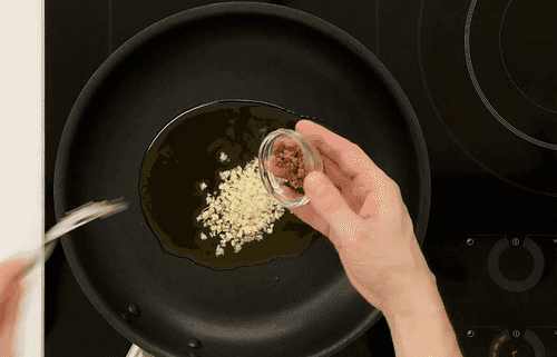 Add finely chopped garlic and anchovies, and hold for a minute.