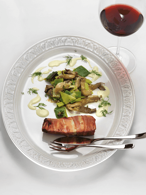 Bacon-wrapped butterfish is a true symphony of flavors, combining the tenderness of a seafood delicacy with the rich saltiness of bacon. This signature recipe merges the softness of butterfish with the crispy texture of smoked strips, creating a harmony of aromas and richness. Oyster mushrooms sautéed in butter with thyme and onion notes add forest depth to the dish, while a creamy sauce adds sophistication. Ginger and garlic bring a hint of spiciness, and dill completes the composition with fresh green accents. This dish is perfect for a festive dinner or romantic evening, offering delight in every bite.