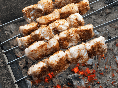 Carefully but tightly thread the fish onto skewers. Place them over the fire, keeping in mind that fish needs less heat than meat, and generously sprinkle with spices. When the bottom side is slightly browned, turn it over and sprinkle again. Fry while turning until a crispy crust forms.