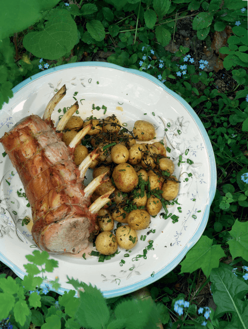 Arista of pork loin with young potatoes and herbs