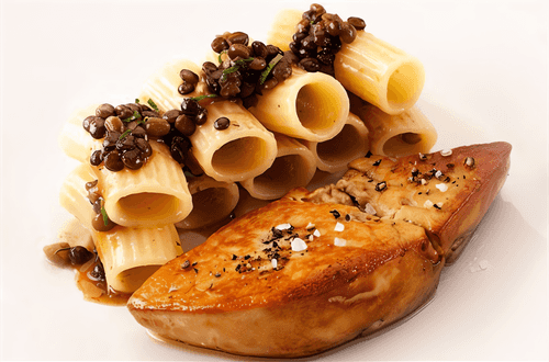 Pasta with foie gras is a refined dish of French cuisine that combines the delicate texture of pasta with the luxurious taste of foie gras. Paccheri, large tubular pasta, perfectly absorbs the aromatic sauce made from lentils, truffle paste, and chicken broth. The origins of this dish lie in gastronomic traditions where foie gras symbolizes sophistication and culinary mastery. Seared foie gras steaks add a rich, buttery flavor while truffle oil highlights the elite nature of the recipe. The taste of the dish is harmonious: velvety lentils, spicy notes of shallots and garlic, deep truffle aroma – all create gastronomic pleasure. Paccheri with foie gras is perfect for a festive dinner and pairs well with a glass of aged white wine, becoming a true celebration of flavor.