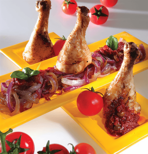 Divide the chicken onto 4 plates and drizzle with tomato sauce. Arrange caramelized onions around the chicken. Drizzle with a small amount of olive oil.