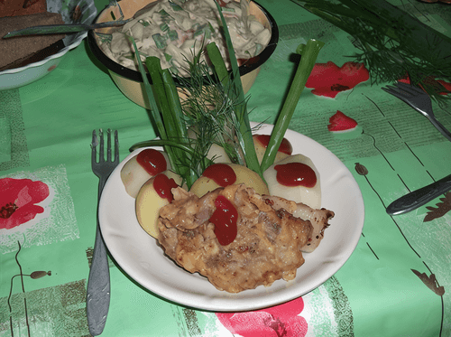 Boil the potatoes in their skins, then peel them. Place the potatoes on a serving plate, followed by a piece of schnitzel and a slice of fried bacon.