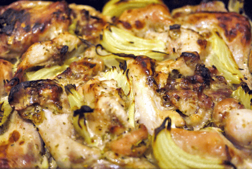 After three hours, transfer the rabbit to a baking tray (preferably two, as one may not fit), sprinkle with salted raw potato slices and garlic heads, and place in an oven preheated to 180 degrees for forty minutes.