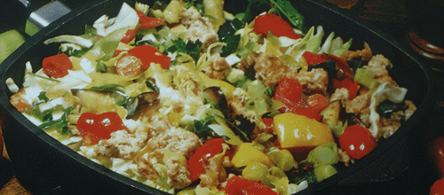Place half of the sautéed vegetables in an even layer in a greased deep skillet, then add a layer of minced meat on top, followed by the remaining sautéed vegetables.