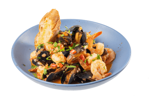 Italian version of fish stew. In addition to cod, there are shrimps and mussels - if you do not live by the sea, boiled and frozen ones will do. The Italian flavor is obtained thanks to the sauce based on white wine, canned tomatoes and olive oil. Do not forget to dry the bread with garlic in the oven.