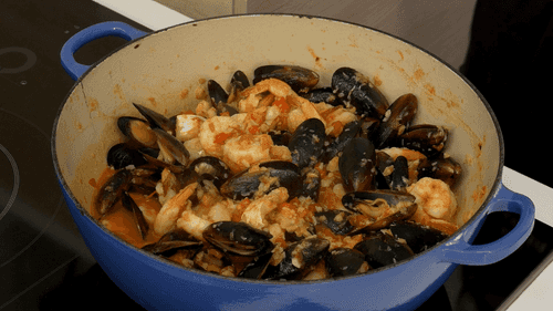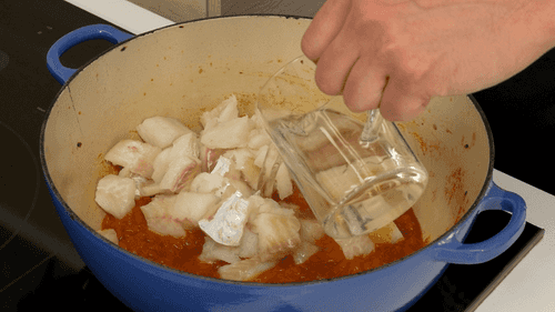 Then add the tomatoes (Italian canned peeled and diced pomodori pelati are best, available in most stores). Simmer for another ten minutes, add pieces of cod fillet, wine and cook for another 3-5 minutes, then add mussels and shrimp and cook for 3-5 minutes; add sugar, salt and pepper.