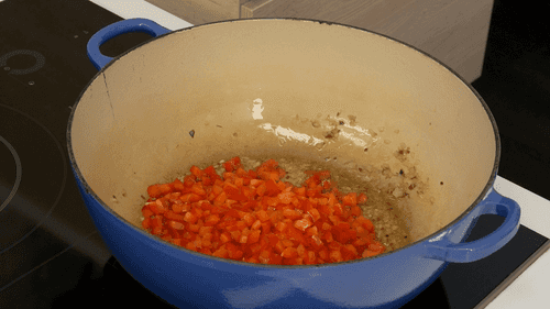 Heat 100 ml of olive oil in a large pot over medium heat, then add finely chopped red onion and sweet pepper, and simmer for about ten minutes until all the vegetables are completely soft and slightly caramelized.