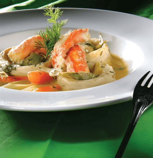 Gradually add wine, crab broth, lemon juice, dill, salt, and pepper.