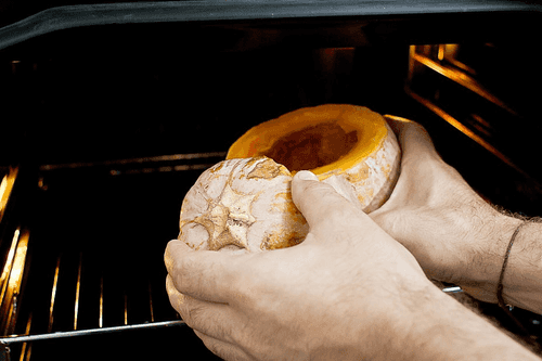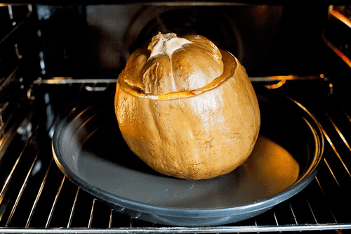 Preheat the oven to 200 degrees. Cut off the top of a small pumpkin (for example, acorn variety) and carefully remove all the seeds from the inside with a spoon. Grease the inside with butter, cover the pumpkin with the cut-off top as a 'lid', and place it in the oven for thirty minutes.