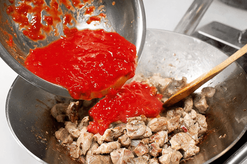 After a couple of minutes, add a can of peeled and finely chopped canned tomatoes, along with the juice, sugar, and salt to the pan. Mix and simmer everything together for another thirty minutes.