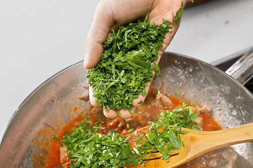 When the meat is ready and the sauce thickens, add saffron, finely chopped parsley, and cilantro to the pan, mix gently, and leave on the heat for another seven to eight minutes.