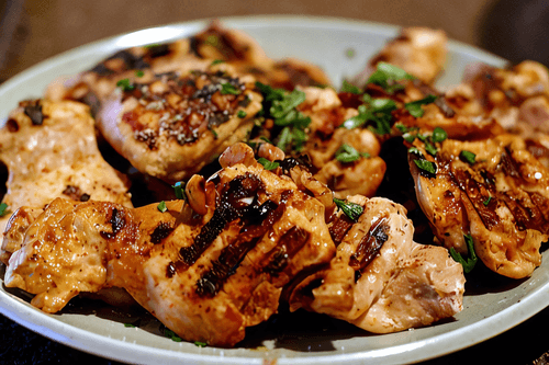 Preheat the grill or pan to maximum temperature. Remove the chicken from the marinade, pat it dry, and fry skin-side down until a nice golden crust forms, then flip the chicken and cook until done. Transfer to a dish or plate and let it rest for about 5 minutes.
