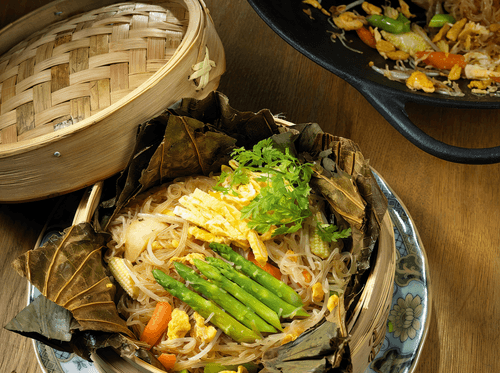 Noodles with porcini mushrooms in lotus leaves