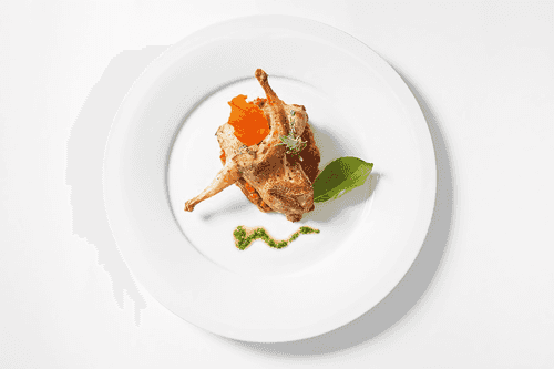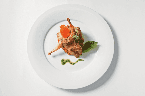 Using a culinary ring, carefully place lentils on a plate, and top with halved roasted quail, cut lengthwise. Garnish the dish with thyme, rosemary, and basil. For color, you can add a bit of pesto sauce and chips made from tomato skins.