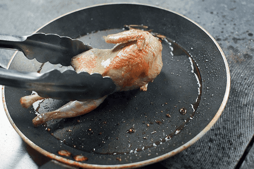 Pour some oil into a heated pan and add a sprig of rosemary. Sear the quail on all sides until golden brown - about four to five minutes. Season with salt and pepper. Transfer the bird to a baking sheet lined with paper and send it to the oven preheated to 200 degrees for about ten minutes. Blot excess oil and fat with a paper towel.